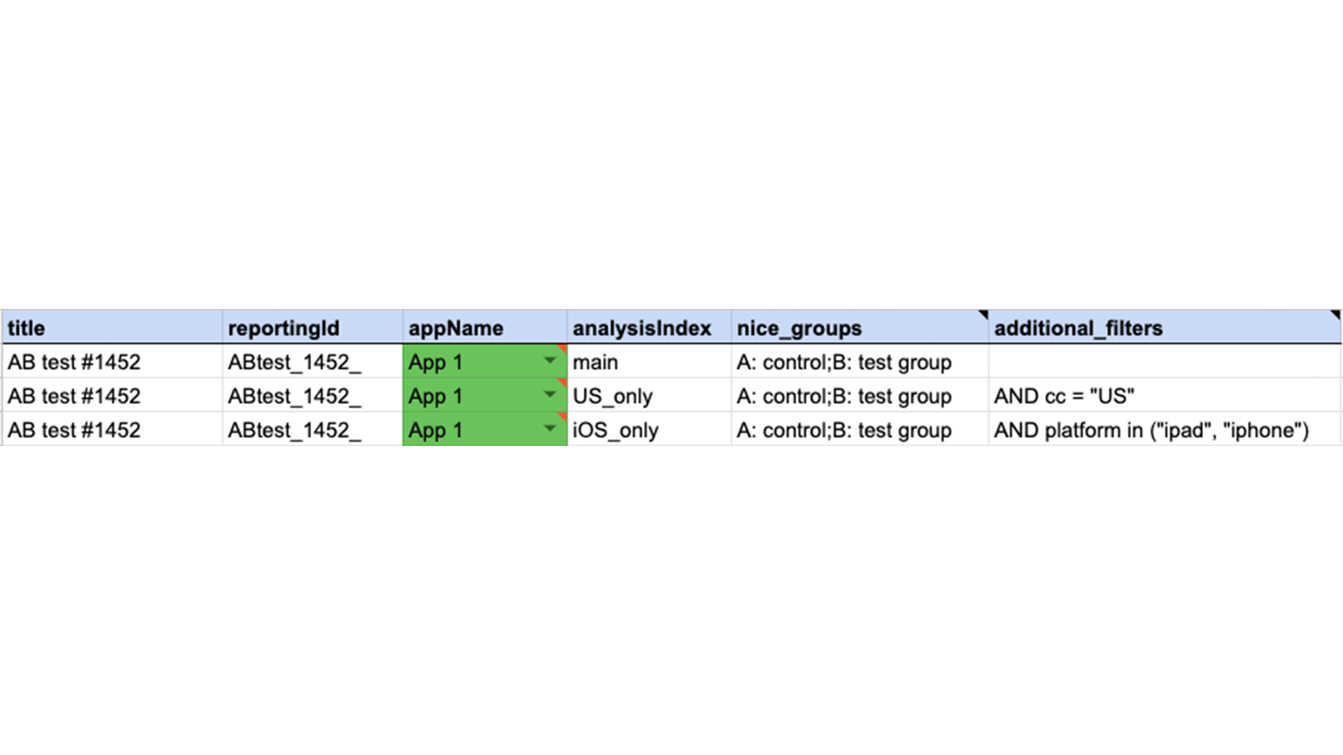 Fig. 3: If we need results from one AB test on different segments, we add rows with defined clusters. In this AB test, we were interested in users from the US using iOS only.